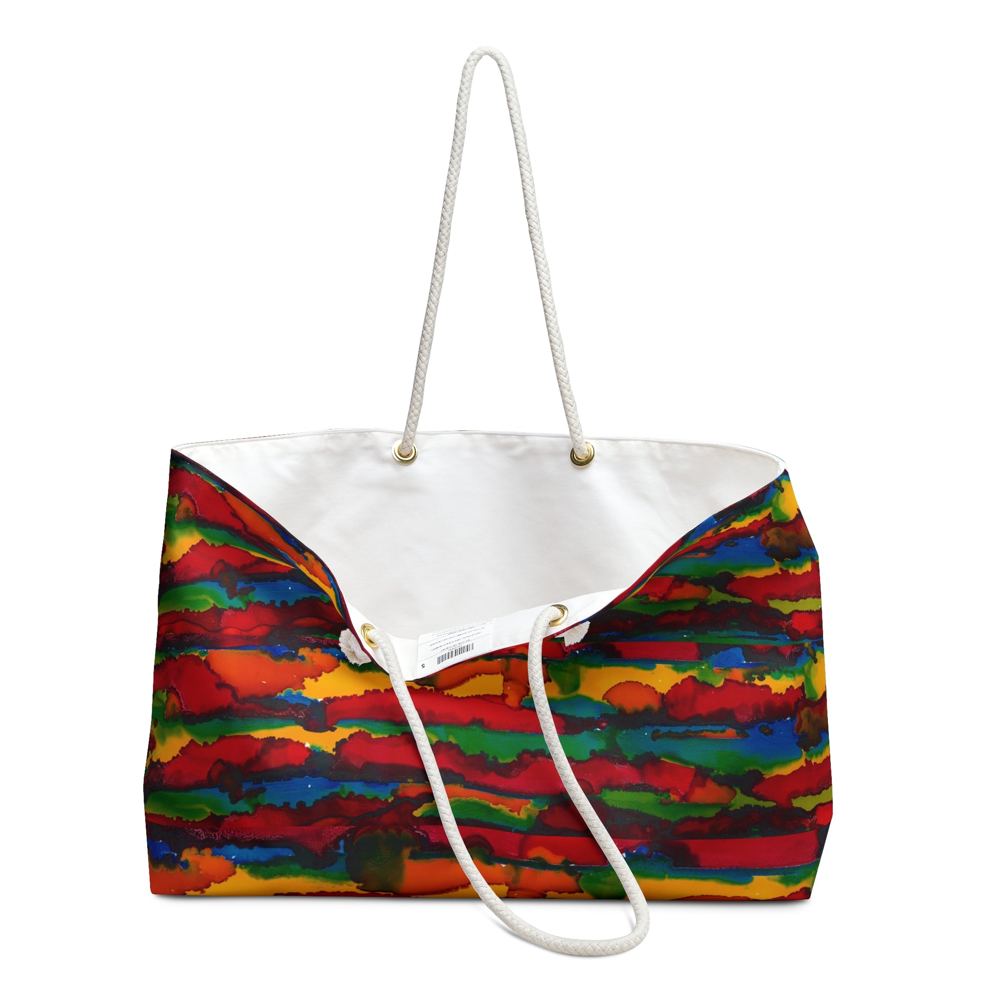 Our oversized Weekender Tote is perfect for your weekend at the beach or in town. The wide-mouthed, durable bag holds a generous amount of personal items and is easily held by its thick rope handles. Printed in the USA from one of my original paintings. .: 100% Spun Polyester .: T-bottom .: Cream sheeting interior lining .: One size: 24" x13"